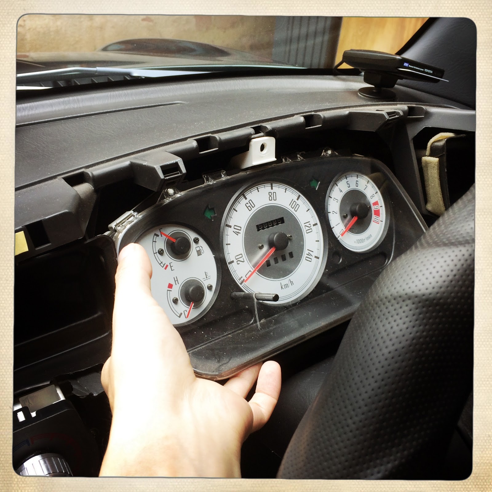 木目調のメーターフードを取り、メーターを引っ張り出して……