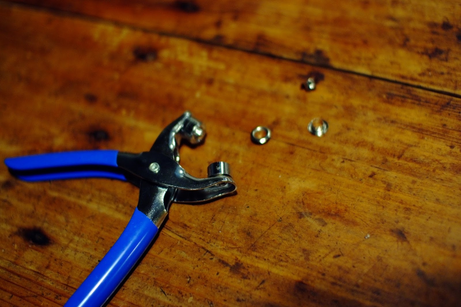 ベルトを適当な長さに切り、折り返してドリルで穴空け。