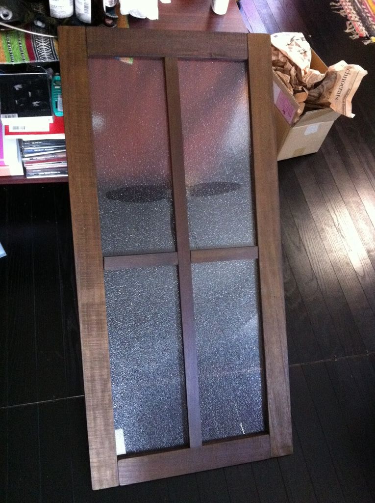 プラスチック加工のネットショップで、取り付ける窓枠の大きさに合わせたすりガラス状のアクリルを購入。その上に、オークステインで塗装した木材を接着剤でくっつけていきます。