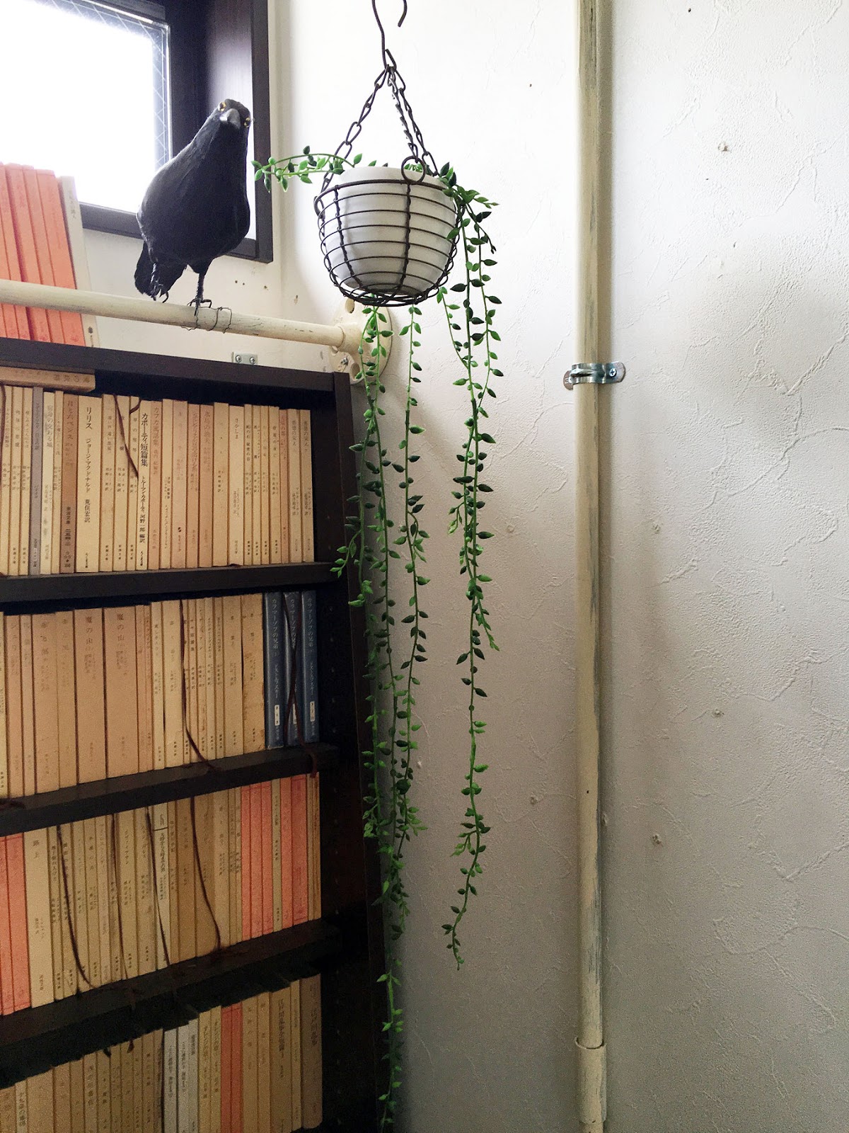 塩ビパイプのブックエンドには、今まで居場所に困っていたカラスくんがとまりました。
