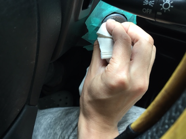 コラムカバーを外すのも面倒なので、周囲をマスキングテープで覆い、いざ磨き。