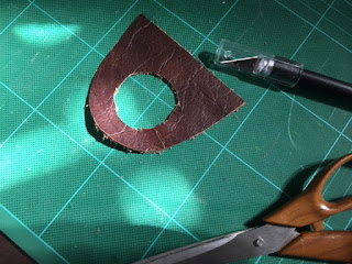 続いて、レザー屋さんで買ったくたびれた感じの本革ハギレ150円と、真鍮の丸カン(内径34mm)150円が登場。