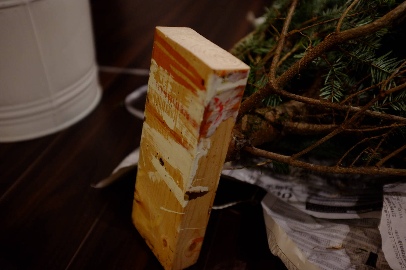 IKEAでは、この木を立てるスタンドも売られていますが、そこはちょっとアレンジしたいじゃんというのが我々あまのじゃくなコモリ夫妻。まあ、家が狭くてスタンドを立てられないというのもあるんですけども。。。