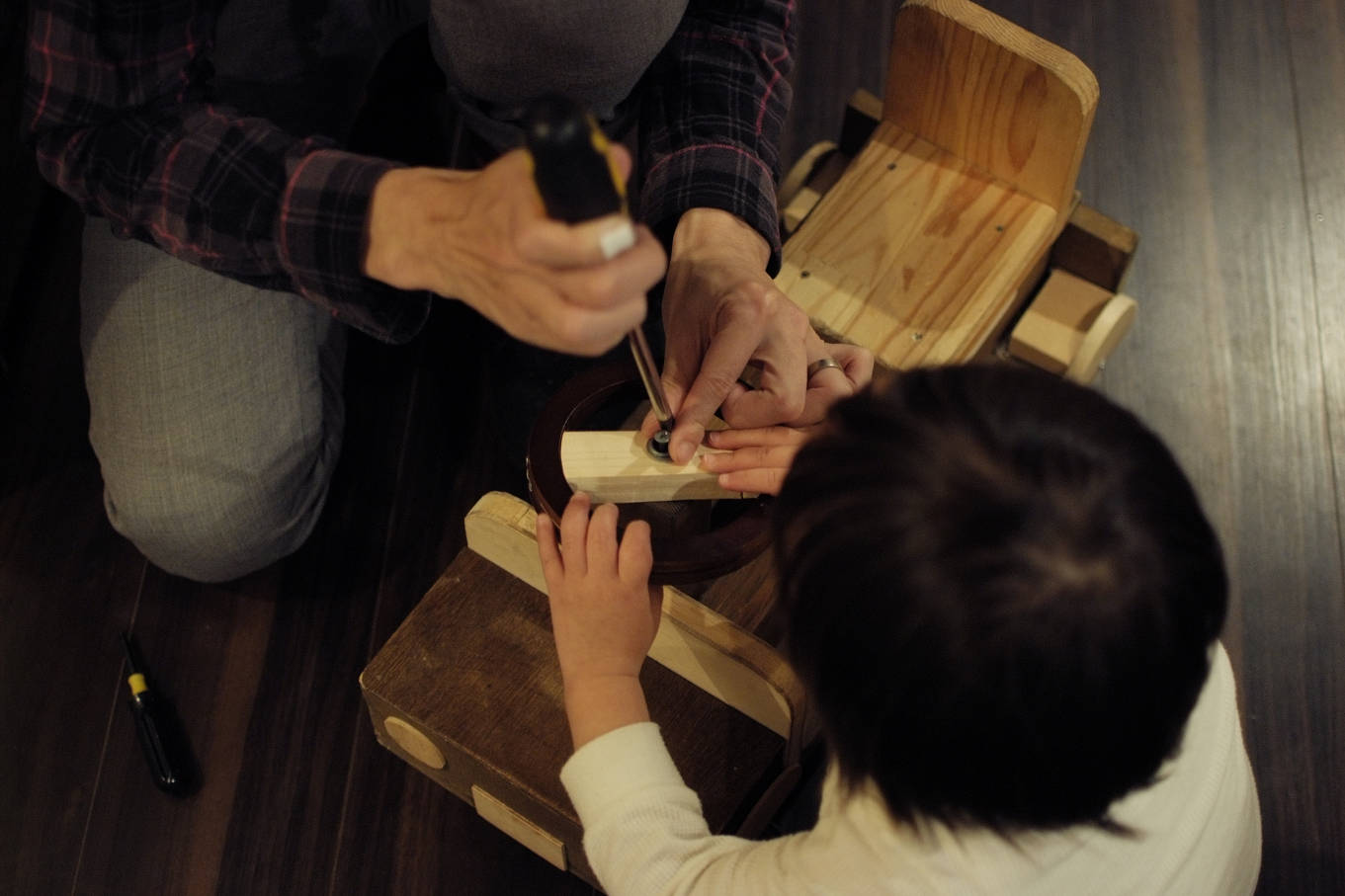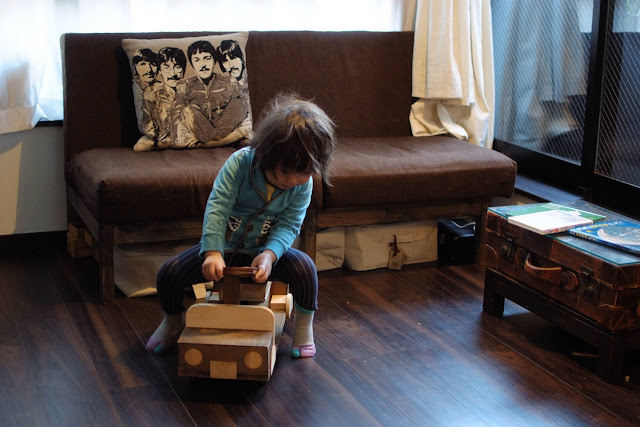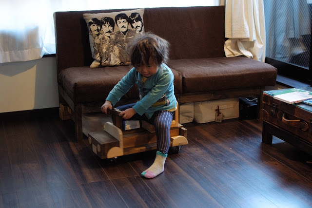 マルクにちなんで、コマルクと名付けられたこの木製車は、KJが3歳になった今もよい遊び道具になっているようです。果たして走行距離はどれくらいだろう(笑)