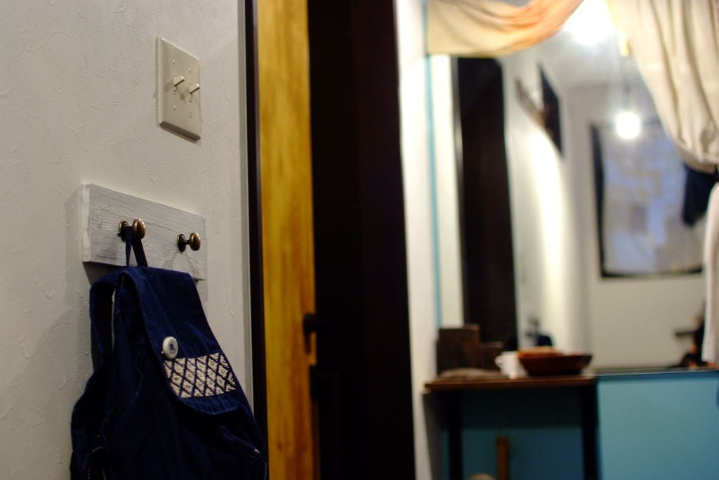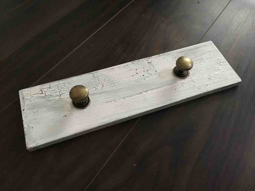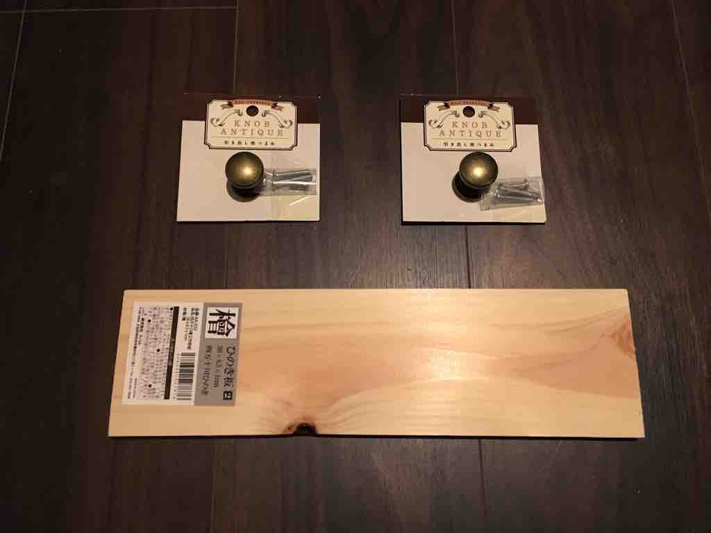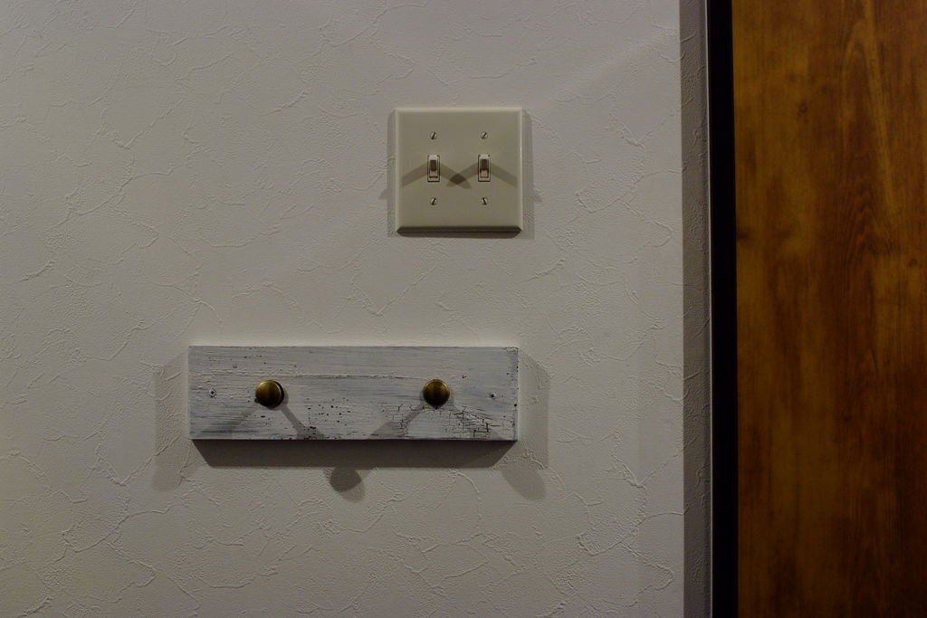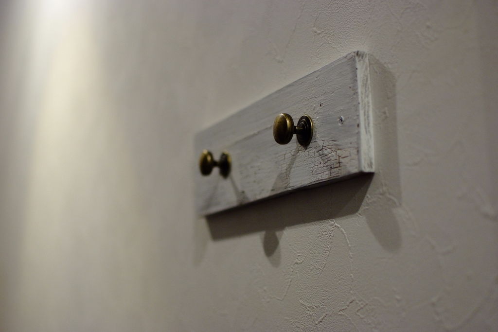 子供の、顔の高さに近い位置に取り付けるので、フックではなく丸い引き出し用のアンティーク・ノブで代用しています。