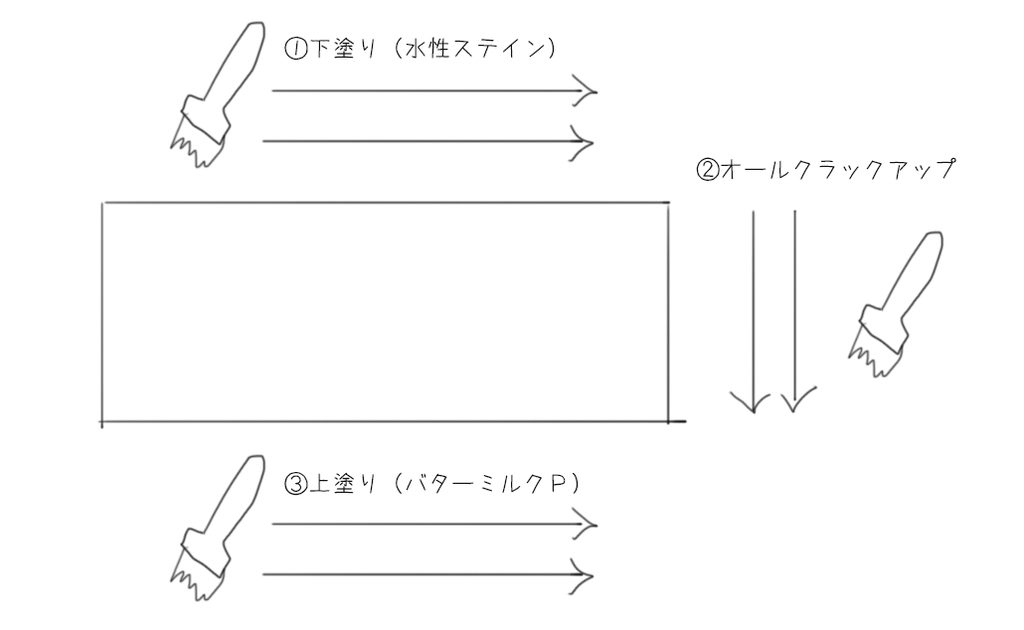 下地色のステインと上塗りはヨコ方向に、オールクラックアップだけ、90度違う方向に塗るのがポイント。