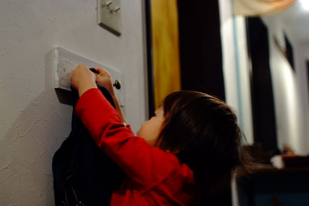 このたび息子KJにも、自分の帽子やバッグは自分でかけてもらおう、と思い立ちまして。
